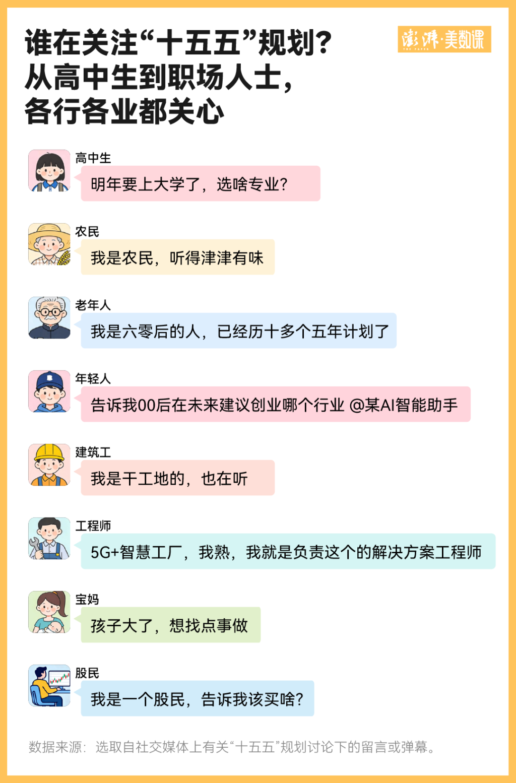 谁在关心“十五五”规划?澎湃美数课工作室通过分析社交媒体上“十五五”规划相关热度较高的2000多条帖子或视频下的26万条讨论、弹幕等互动信息,我们看到了各种身份的普通人都关注着这份规划。