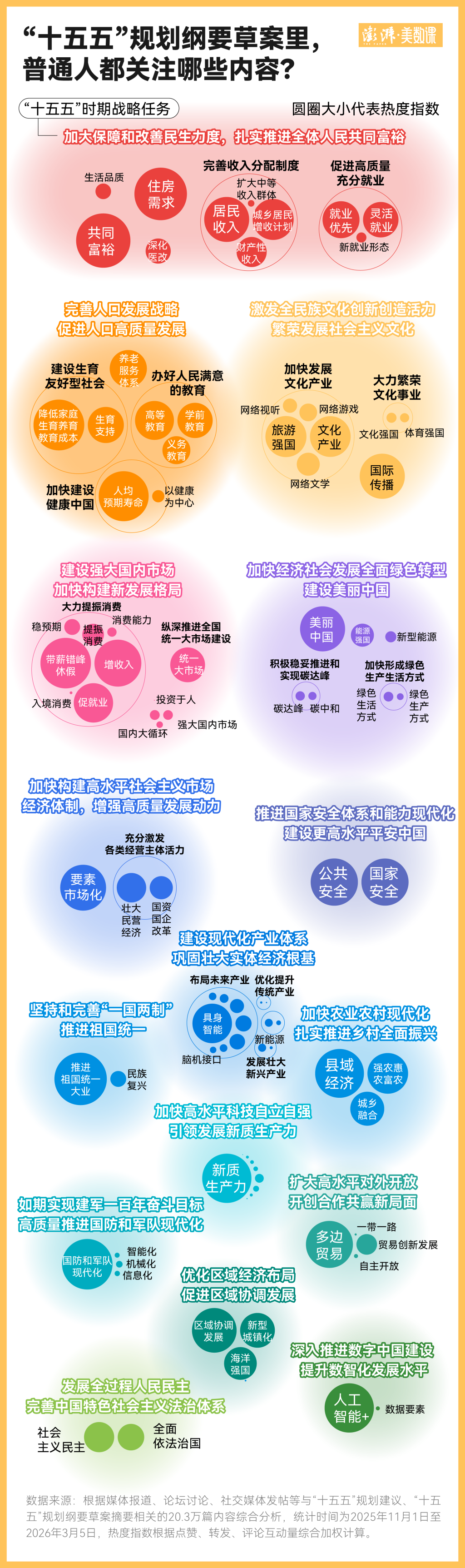 澎湃美数课工作室梳理了2025年11月1日至2026年3月5日这段时间中,媒体报道、论坛讨论、社交媒体发帖中与“十五五”规划建议、“十五五”规划纲要草案摘要相关的20.3万条内容,通过分析点赞、转发、评论等互动信息综合整理出这份普通人最关心的“十五五”任务。