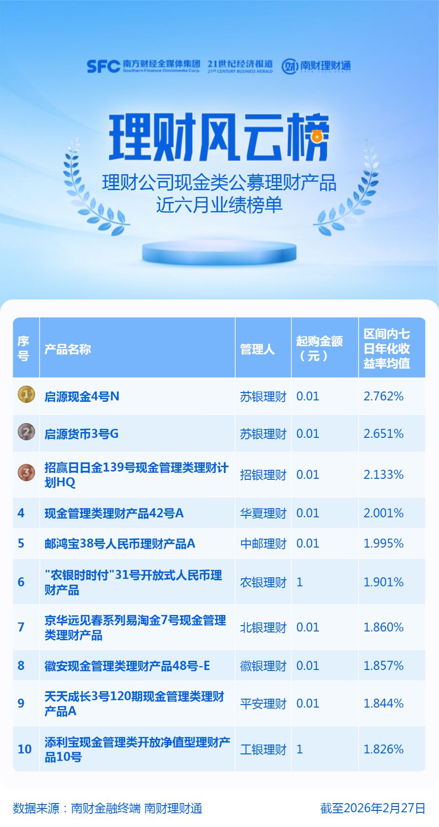 产品统计范围为理财公司发行的公募现金类产品,统计截止日期为2026年2月27日,统计区间为近六个月。