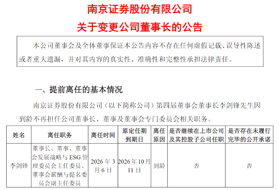 3月6日晚,南京证券(601990.SH)公告称,李剑锋因到龄提前离任,不再担任公司董事长、董事及董事会专门委员会相关职务。公司董事会召开会议,选举总裁夏宏建为第四届董事会董事长,任期自董事会审议通过之日起至本届董事会届满时止。