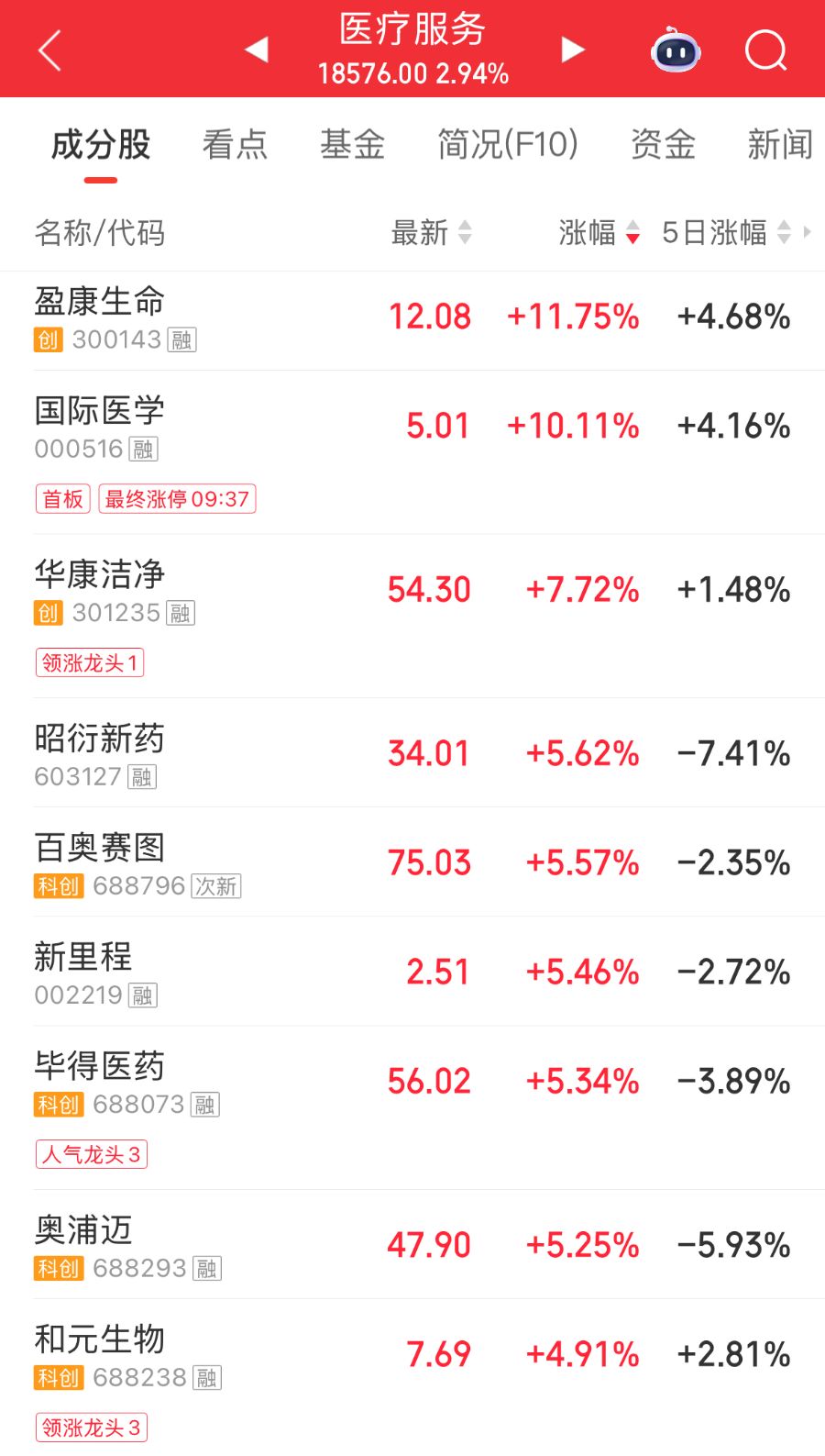 3月6日,A股医药板块大爆发,医疗服务方向领涨。个股方面,截至10:25,盈康生命涨超10%领涨,国际医学涨停,华康洁净、昭衍新药、百奥赛图等多只个股跟涨。