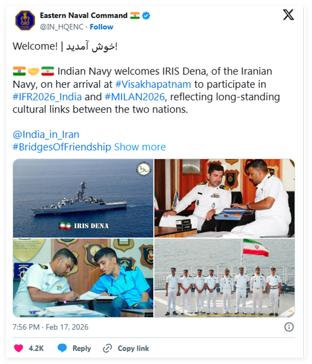 在那一刻,他们眼里只有战果,没有生命。 80多条年轻的生命,就这样永远葬身在了印度洋。 这中间,有着太多的世态炎凉。 我刚开始还很奇怪,为什么伊朗的军舰,会被美国核潜艇猎杀在了斯里兰卡附近。 后来看报道知道,这艘伊朗军舰,是应印度之邀去做客的,参加了两场印度海军活动: 一场是代号“米兰”的多国海军联合演习和联欢活动,另一场则是2026印度国际阅舰式活动。 伊朗军舰来捧场,印度很高兴。 2月的印度海军官方账号,还特意发帖表示热烈欢迎,称伊朗军舰的到来,“反映了两国间长久的文化联系”。
