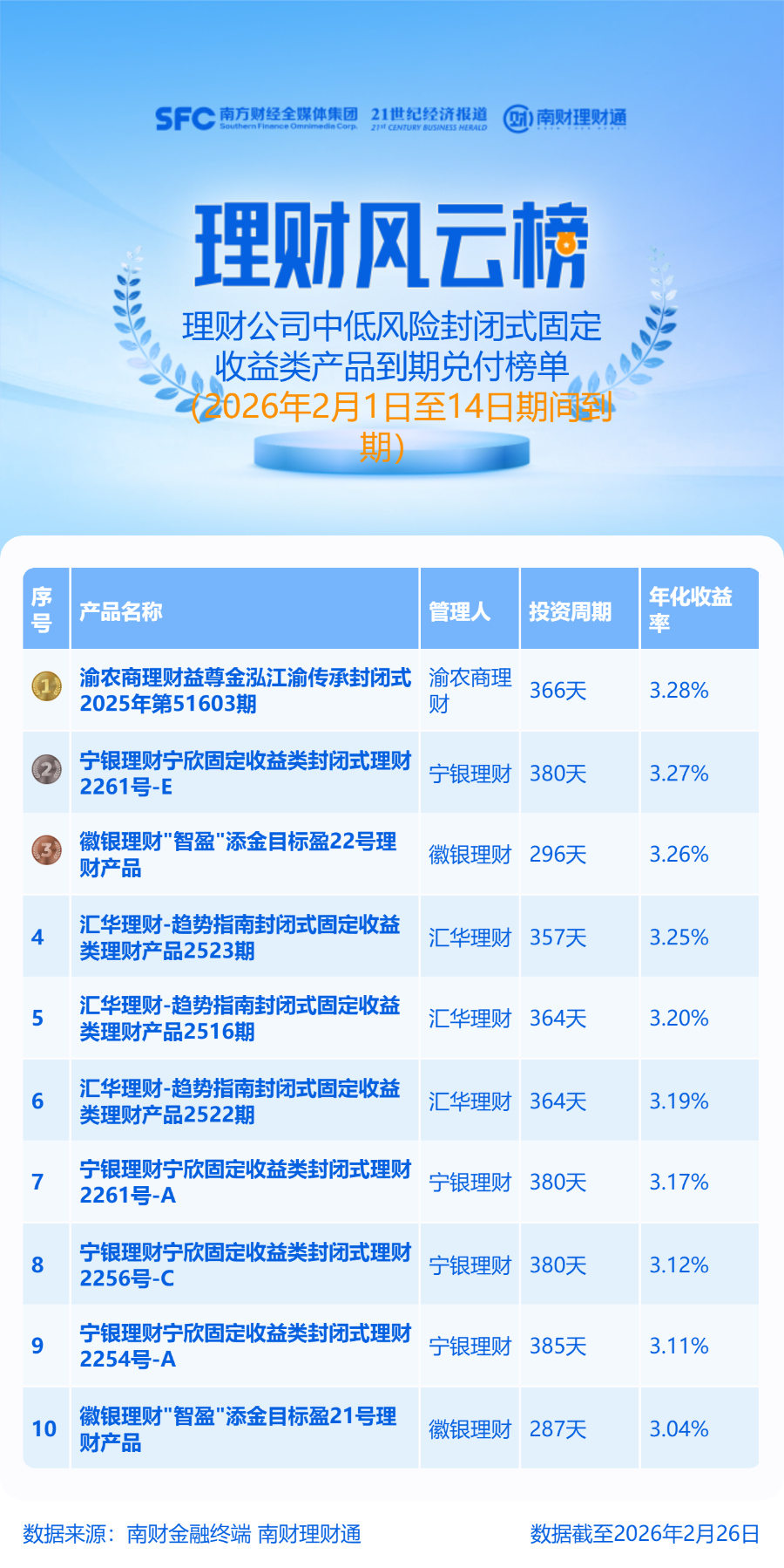 从理财产品到期兑付收益来看,2026年2月中上旬(2月1日-14日),理财公司共有213只(按产品各份额分开统计)R2中低风险等级封闭式固收类理财到期,到期兑付的算数平均年化收益率为2.52%。