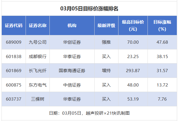 越声投研数据显示,3月5日,券商给予上市公司目标价共5次,按最新收盘价计算,目标价涨幅排名居前的公司有九号公司、成都银行、长飞光纤,目标价涨幅分别为47.68%、38.15%、31.57%,分别属于摩托车及其他、城商行、通信设备行业。