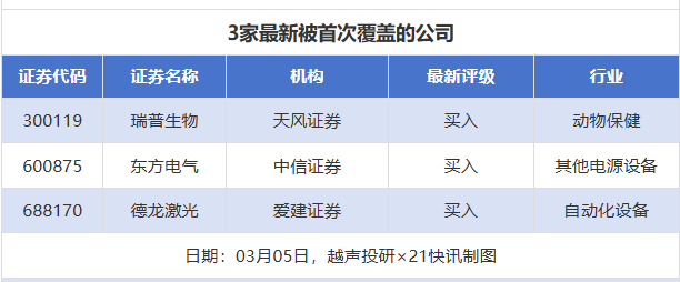 首次覆盖方面,3月5日券商共给出了3次首次覆盖,其中瑞普生物获得天风证券给予“买入”评级,东方电气获得中信证券给予“买入”评级,德龙激光获得爱建证券给予“买入”评级。