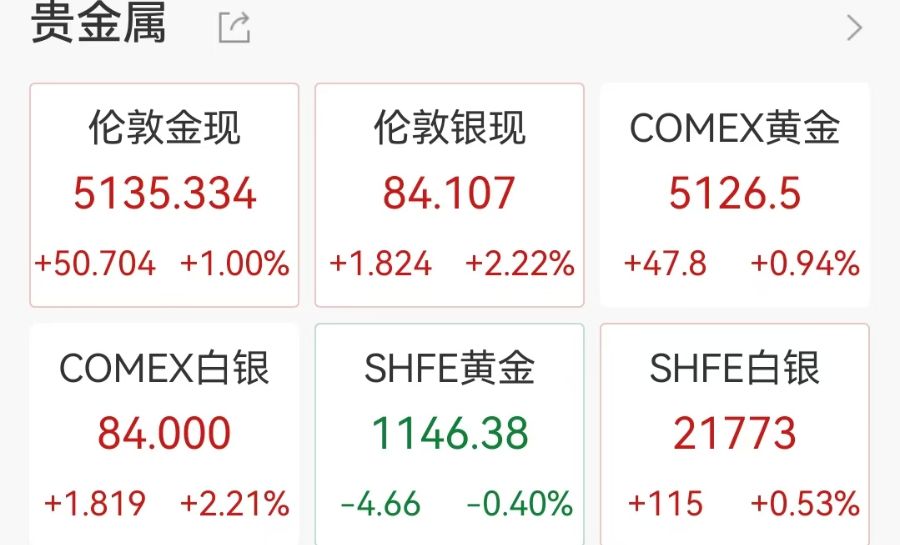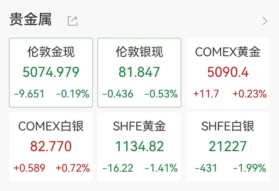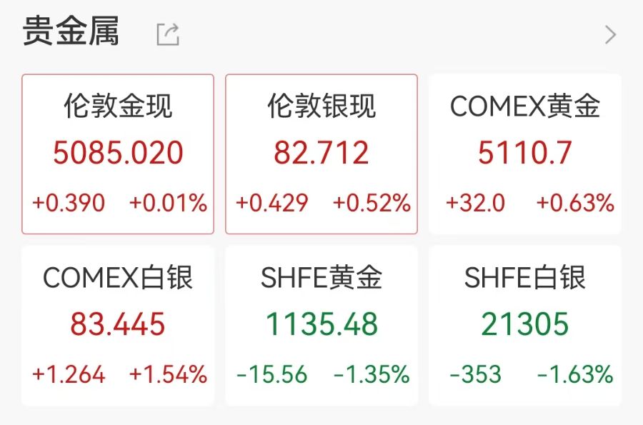 现货黄金现报5085美元/盎司,现货白银现报82.712美元/盎司,日内涨0.52%。
