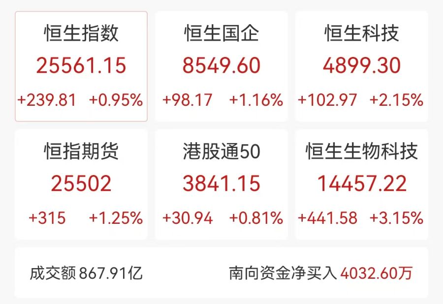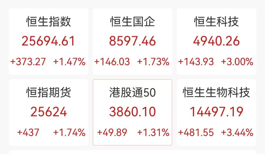 港股高开高走,恒生科技指数涨3%,恒指涨1.47%,京东物流涨超19%,京东集团涨超7%,网易涨超5%。