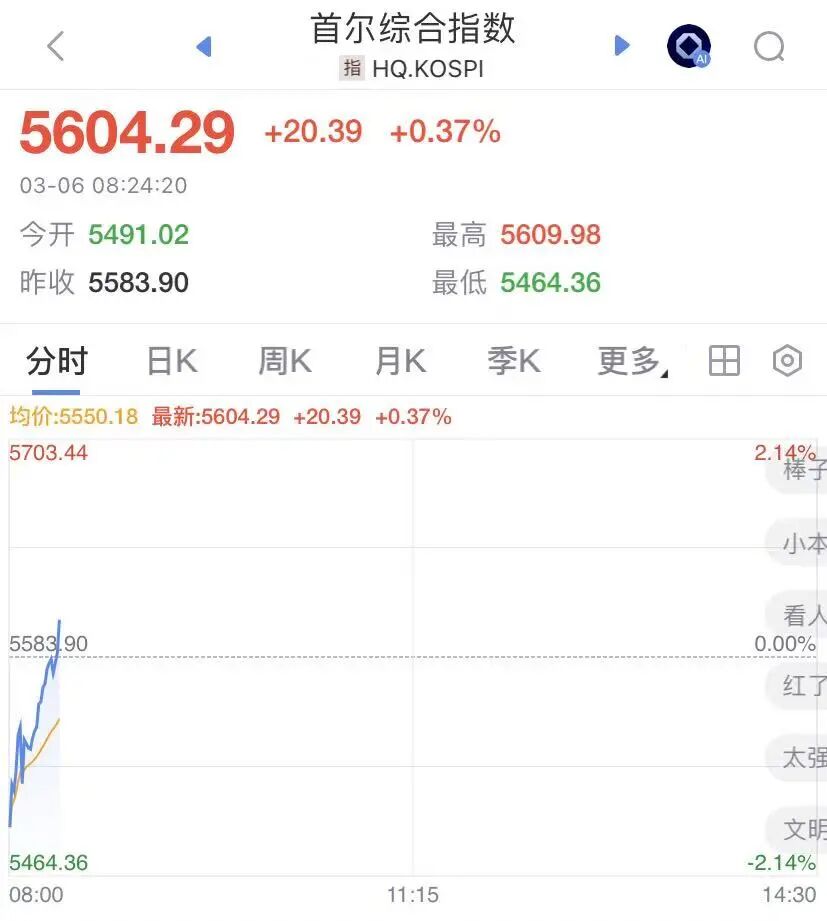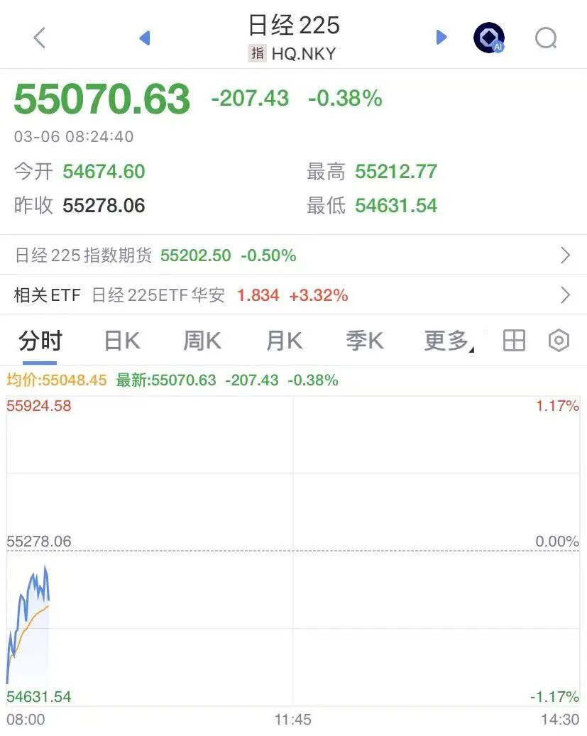 截至北京时间8:20,日经225指数重回55000点,跌幅有所收窄,日内下跌0.38%;韩国KOSPI指数由跌转涨,此前一度跌超2%。韩国因期货大幅上涨,暂停KOSDAQ市场的程序化交易。