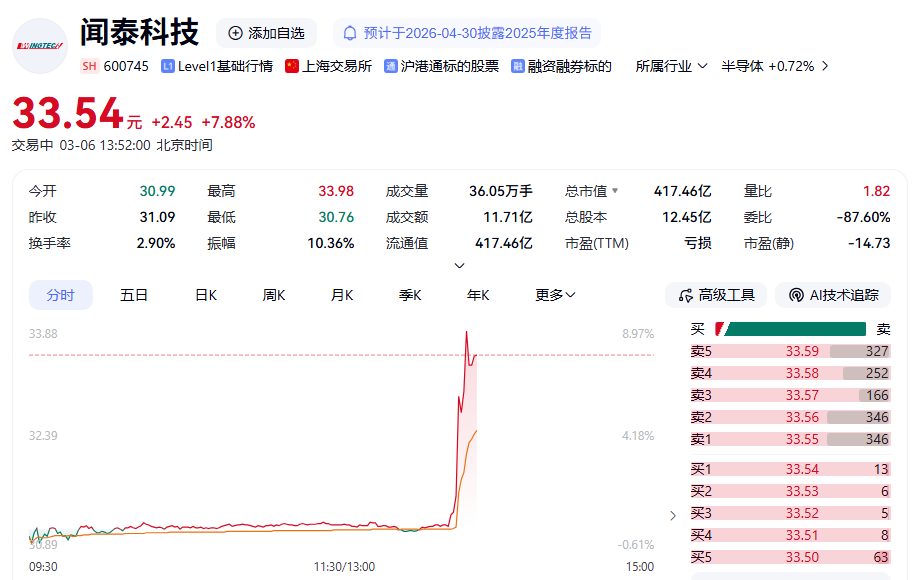 闻泰科技(600745)股价直线拉升。