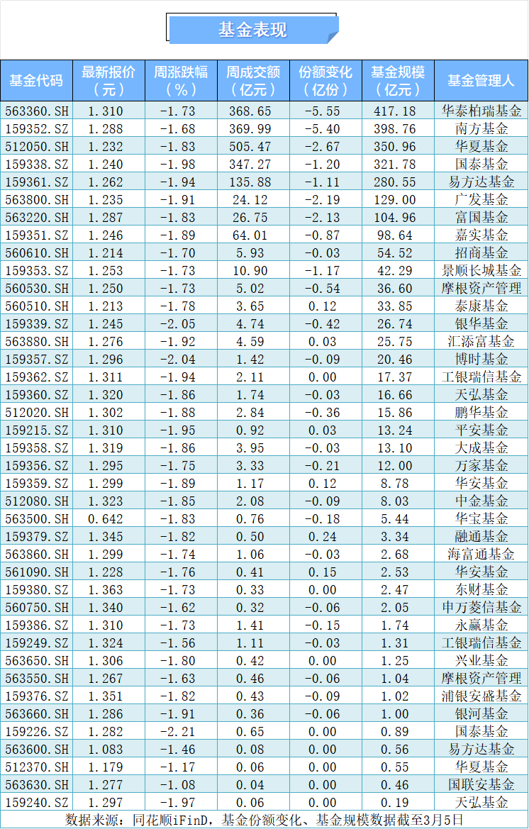 本周中证A500指数下跌1.78%,截至3月6日收盘,报5859.12点。本周日均平均成交额为9812.43亿元,单日成交额环比上涨7.73%。本周40只中证A500基金全线下跌,其中国泰基金的增强型ETF领跌,跌幅为2.21%;国联安的基金跌幅最小,为1.08%。