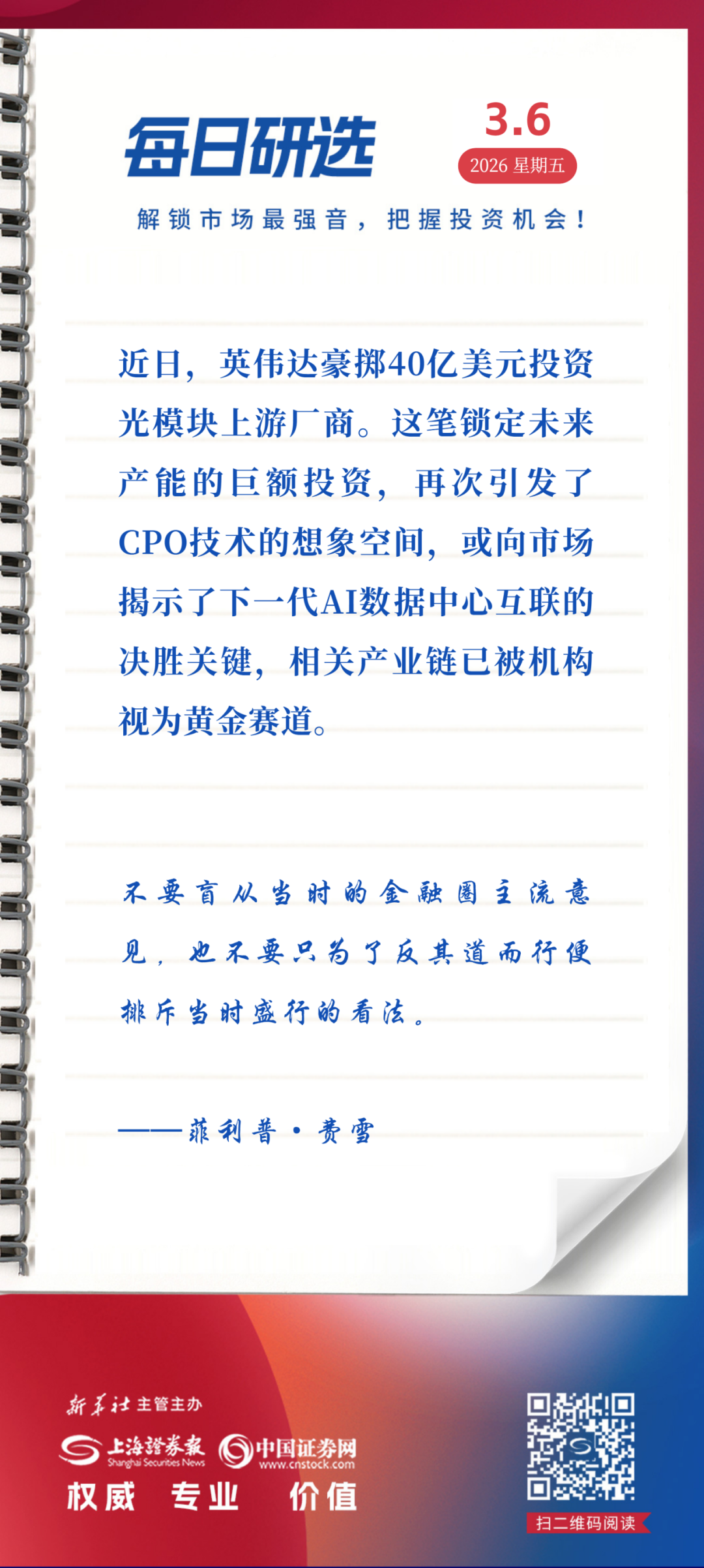 近日,英伟达豪掷40亿美元投资光模块上游厂商。这笔锁定未来产能的巨额投资,再次引发了CPO技术的想象空间,或向市场揭示了下一代AI数据中心互联的决胜关键,相关产业链已被机构视为黄金赛道。