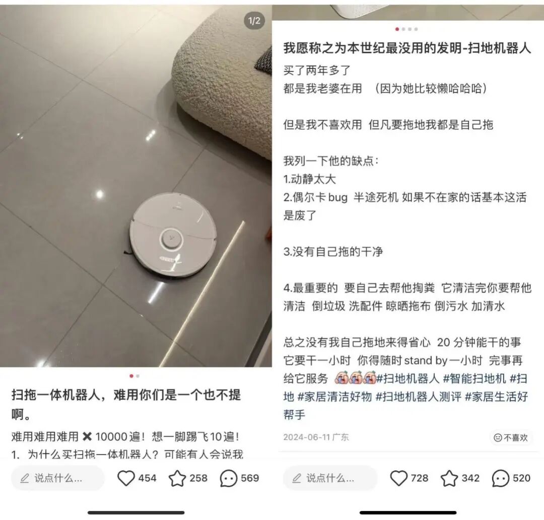 在社交平台上搜索“扫地机器人”,避雷贴的数量并不少。消费者吐槽智能清洁家电越来越贵,却越来越难用;不管是扫地机器人还是拖地机,往往无法彻底清理卫生死角,看似智能,实则也需要人工善后,还很容易故障损坏,最终只能放到角落里吃灰。