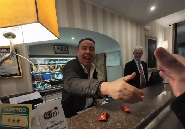 酒店前台小哥收到酥心糖后与中国游客握手致谢。