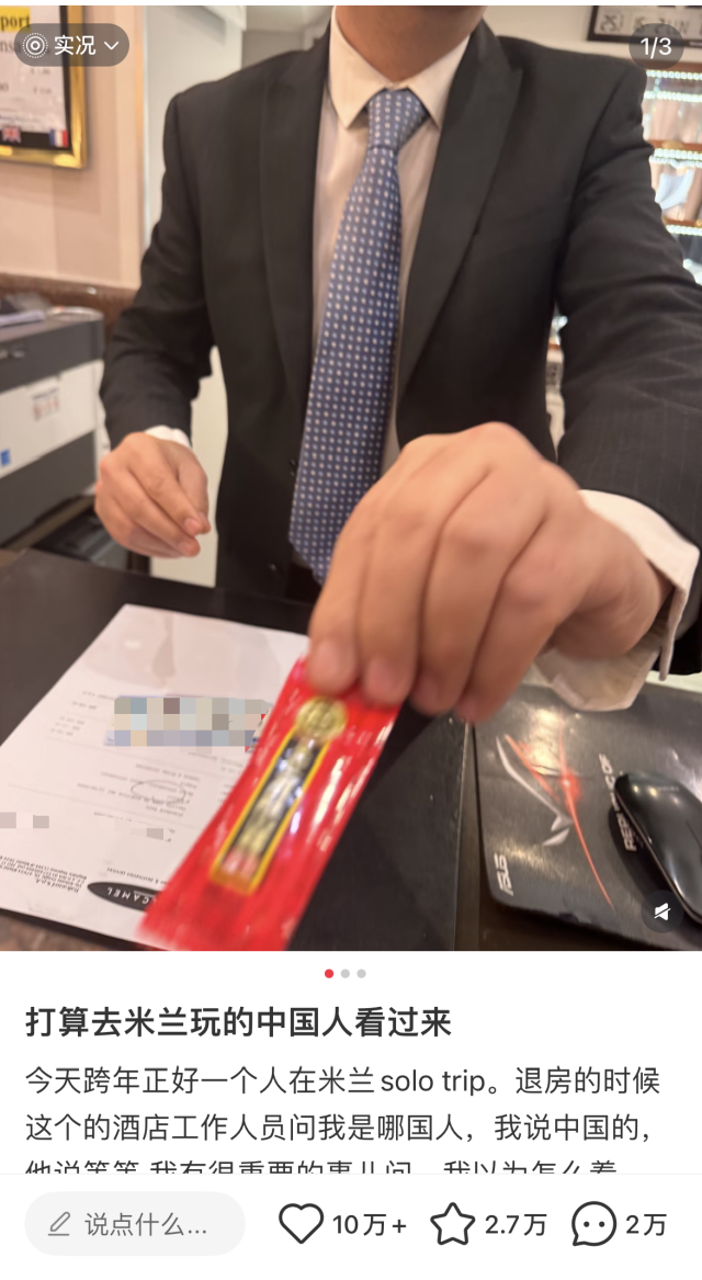 “充电的时候,前台人员就过来问我来自哪里?我说我是中国人。”孙女士回忆说,前台工作人员先是和她聊了些对米兰的感受,随后突然想起什么似的,“他说他有一件很重要的事。”