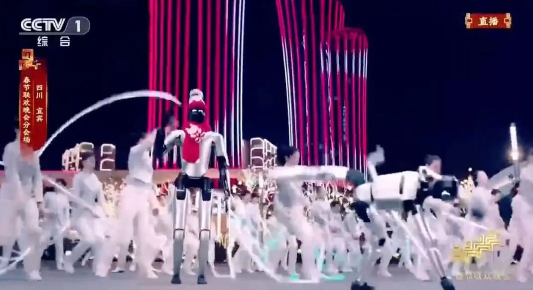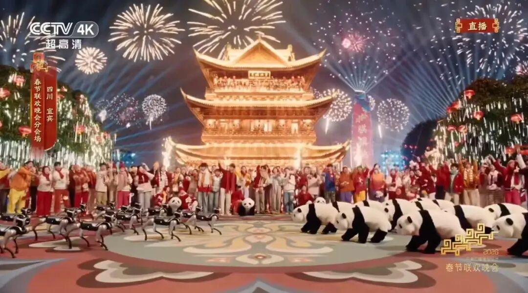 在四川宜宾分会场《立上游》节目的现场镜头中,出现了 MagicDog 机器狗和小熊猫对阵,上百台机器熊猫同时登场,在城市广场完成奔跑、列阵与舞蹈编排动作。据了解,这是全球首次上百台四足机器人在公开舞台实现同步演绎。