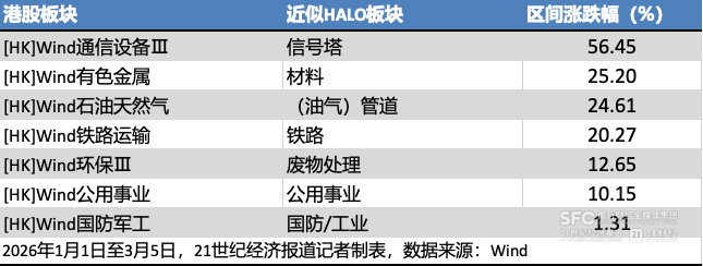 相比之下,港股汇总与HALO逻辑契合的板块则相对强势。wind数据显示,从2026年1月1日至3月3日,港股通信设备板块涨约56.45%,石油天然气、有色金属、铁路运输涨幅约20%,环保板块、公用事业涨幅达10%,国防军工涨约1.3%。这证明港股的确对Halo相关标的颇为“买账”,并愿意为其支付“避风港溢价”。