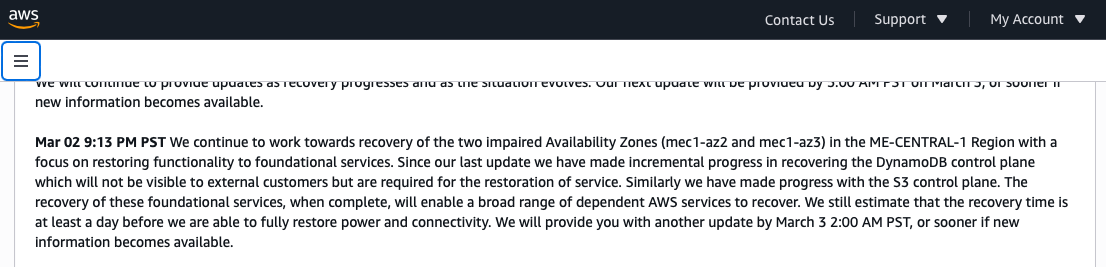 一日后,AWS进一步披露中东数据中心的受袭情况,称阿联酋和巴林两国的AWS基础设施均因无人机袭击遭受物理损坏。