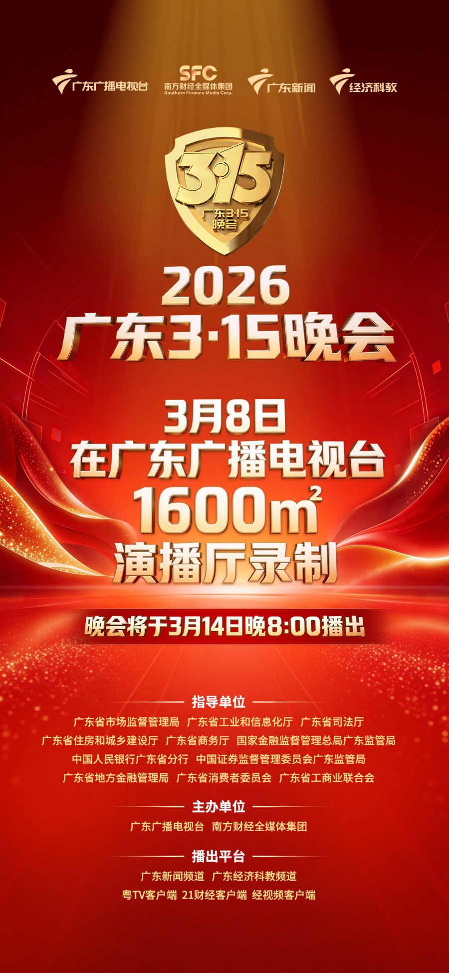 2026《广东3·15晚会》定于3月14日晚8:00在广东新闻频道、广东经济科教频道并机播出,粤TV客户端、21财经客户端、经视频客户端也将同步进行网络直播。