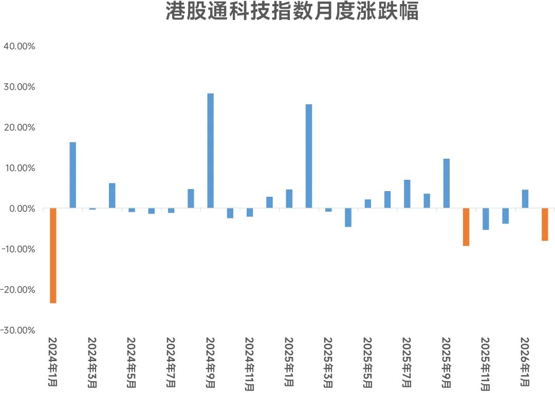 Wind数据显示,港股通科技指数于今年2月下跌8.06%,为2024年以来第三大月度跌幅,仅次于2024年1月(-23.45%)与2025年10月(-9.34%)。