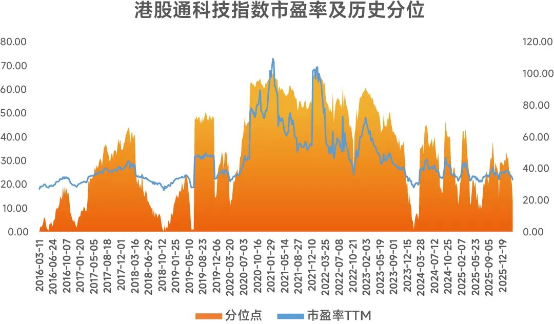 数据来源:Wind;港股通科技指数近5年每一自然年度的涨幅分别为:-25.73%(2021年)、 -31.68%(2022年)、-13.57%(2023年)、19.36%(2024年)、34.97%(2025年)。相关指数历史业绩不预示其未来表现,不构成对相关类型基金未来业绩表现的保证。