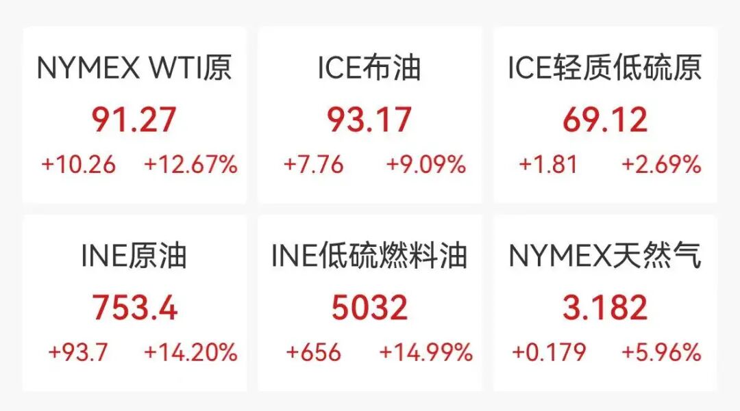 国际油价大幅飙升,创2023年10月以来新高。WTI原油报每桶91.27美元,大涨超12%,本周累涨35.6%;布伦特原油报每桶93.17美元,涨超9%,本周累涨27.88%。两者分别创自1983年和1991年有记录以来的最大周涨幅。