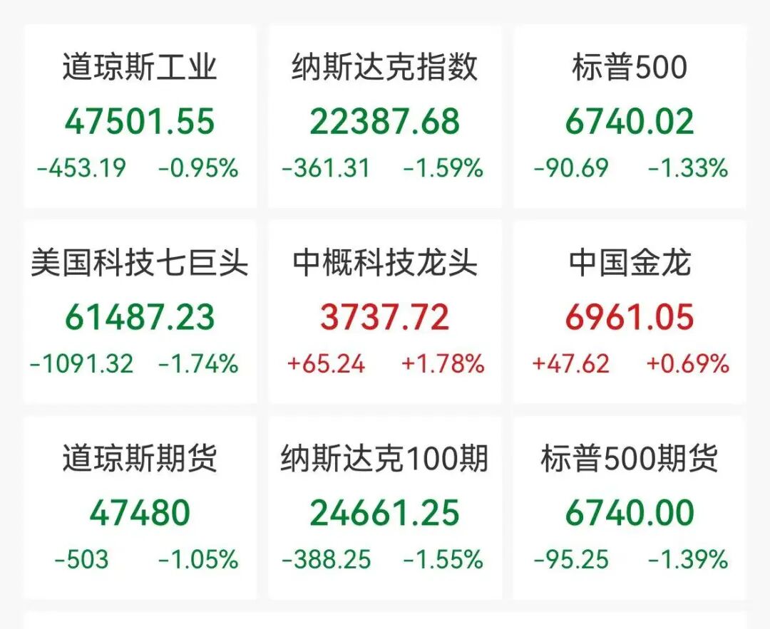 大型科技股普跌,英特尔跌超5%,英伟达跌约3%,亚马逊、特斯拉、Meta跌超2%,苹果跌逾1%,微软、谷歌小幅下跌。