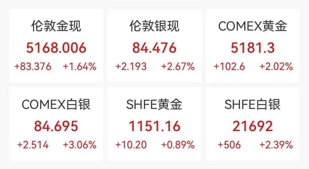 现货黄金报5168美元/盎司,日内涨1.64%;现货白银报84.47美元/盎司,日内涨2.67%。