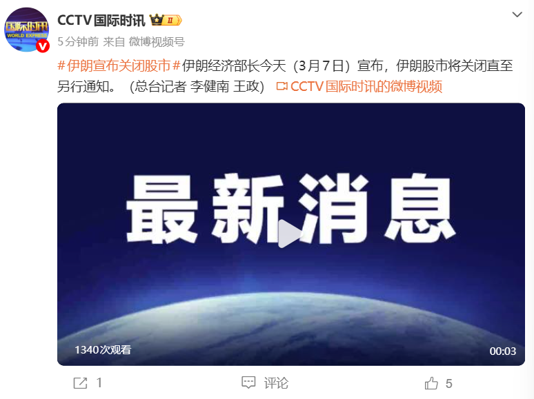 据CCTV国际时讯报道,伊朗经济部长今天(3月7日)宣布,伊朗股市将关闭直至另行通知。