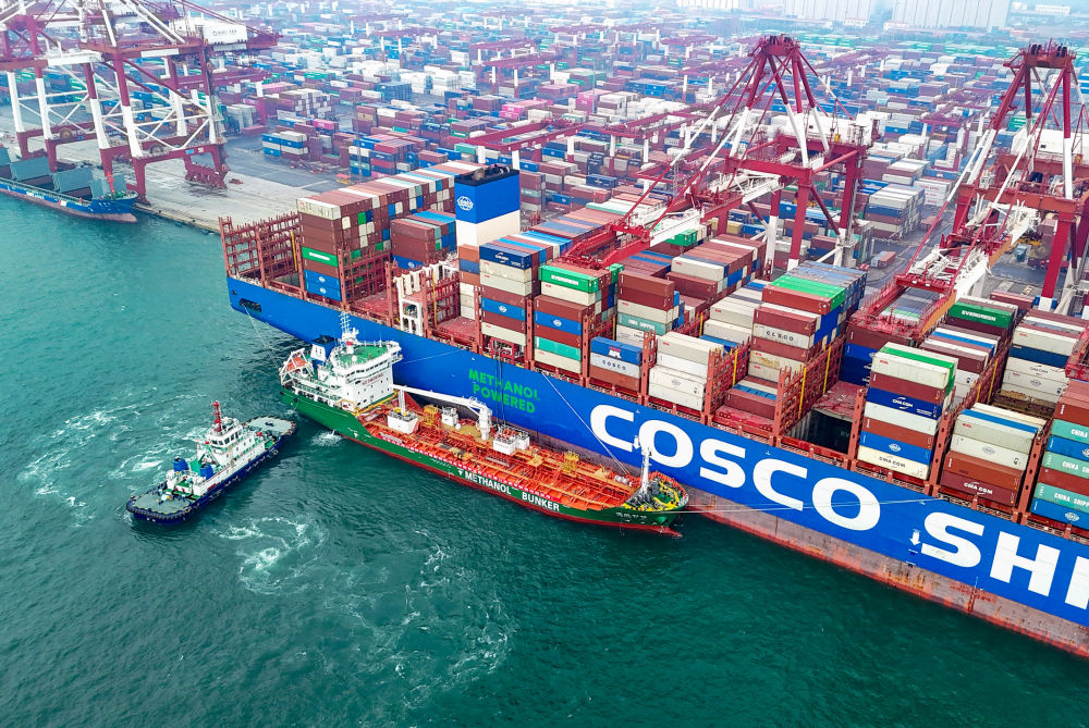 3月2日,在山东港口青岛港,甲醇加注船“建航利达”轮为一艘货轮进行绿色甲醇“船对船”加注作业(无人机照片)。新华社发(张进刚摄)