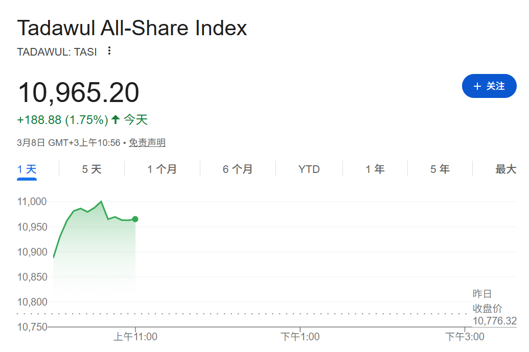 大家好,关注一下沙特股市的表现。(泰勒注: 沙特证券交易所的交易时间为周日至周四,因为当地人口通常将周五和周六视为休息的周末。 ) 3月8日,海湾地区股市普遍上涨,其中 沙特股指连续第五个交易日上涨 。此前, 沙特 方面警告伊朗称,如果针对沙特及其能源行业的袭击继续发生,沙特可能会采取对等回应。