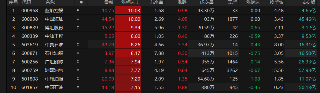 石油石化板块持续活跃,截至发稿,蓝焰控股、中国海油涨停。