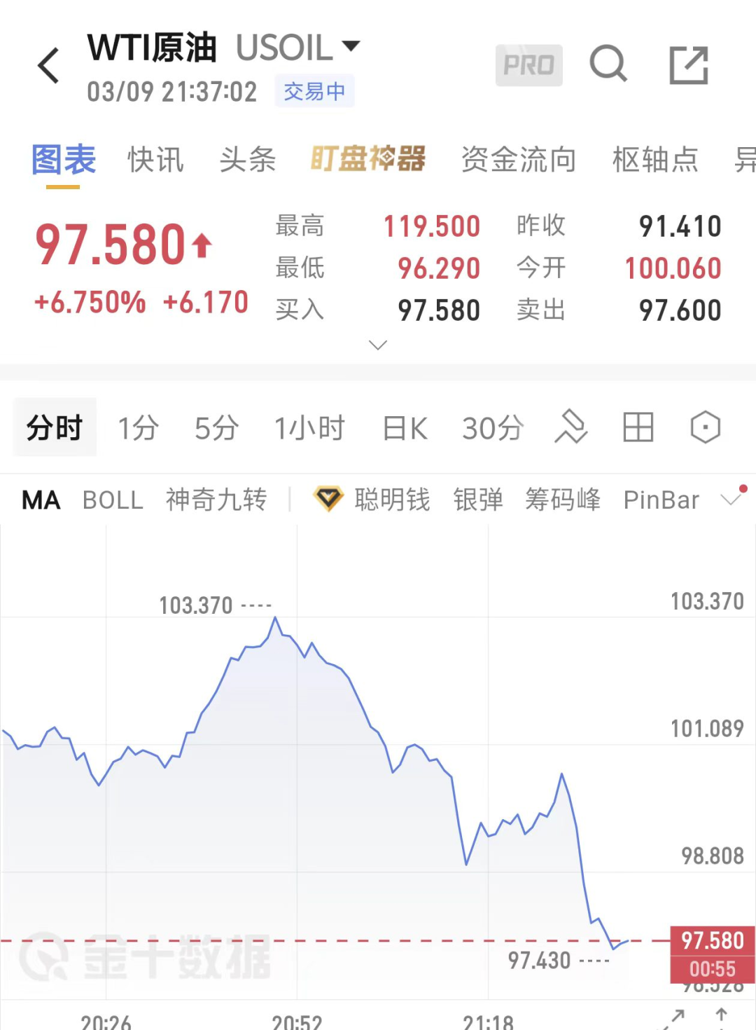 WTI原油短线跳水,截至发稿,涨幅收窄至6.7%。