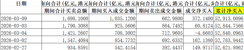 与此同时,3月9日,南向资金累计净买入额亦创下历史新高,达到5.29万亿港元。