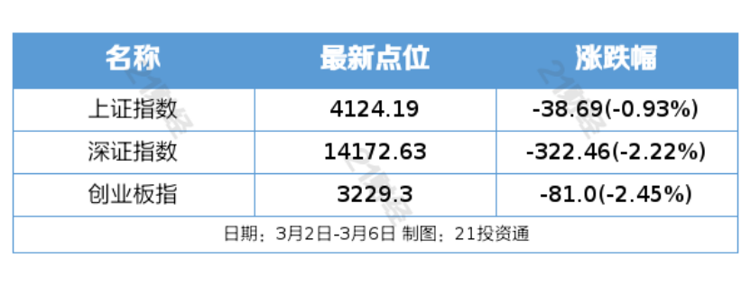 过去一周(3月2日—3月6日),A股三大指数集体下跌。截至3月6日收盘,上证指数报4124.2点,周跌0.9%;深成指报17172.6点,周跌2.2%;创业板指报3229.3点,周跌2.4%。
