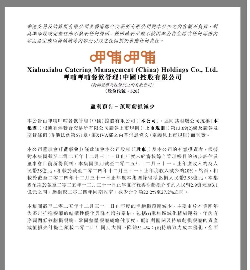 消息面上,3月6日晚,呷哺呷哺发布2025年度业绩预告。公告显示,公司预计本年度实现营业收入38亿元,同比减少约20%;营收规模持续萎缩,相较于2021年巅峰时期的61.47亿元,缩水幅度超38%。净利润方面,预计2025年继续亏损2.9亿元至3.1亿元,与上年同期亏损3.98亿元相比,减亏22.2%至27.2%。