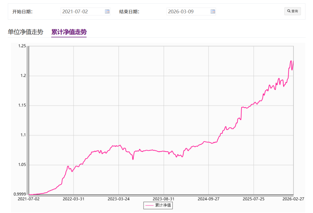 事实也确实如此。从产品的净值走势可以看出,产品在2021年三季度成立后,经历了2022年和2023年的市场调整,产品净值表现震荡,2024年在市场反弹上涨的背景下净值明显上涨,2025年更是在市场的强势上涨下净值“一路狂飙”。从短期业绩来看,产品近3月年化收益率达到14.11%,近6月年化收益率达到8.06%,近1年年化收益率达到10.15%。