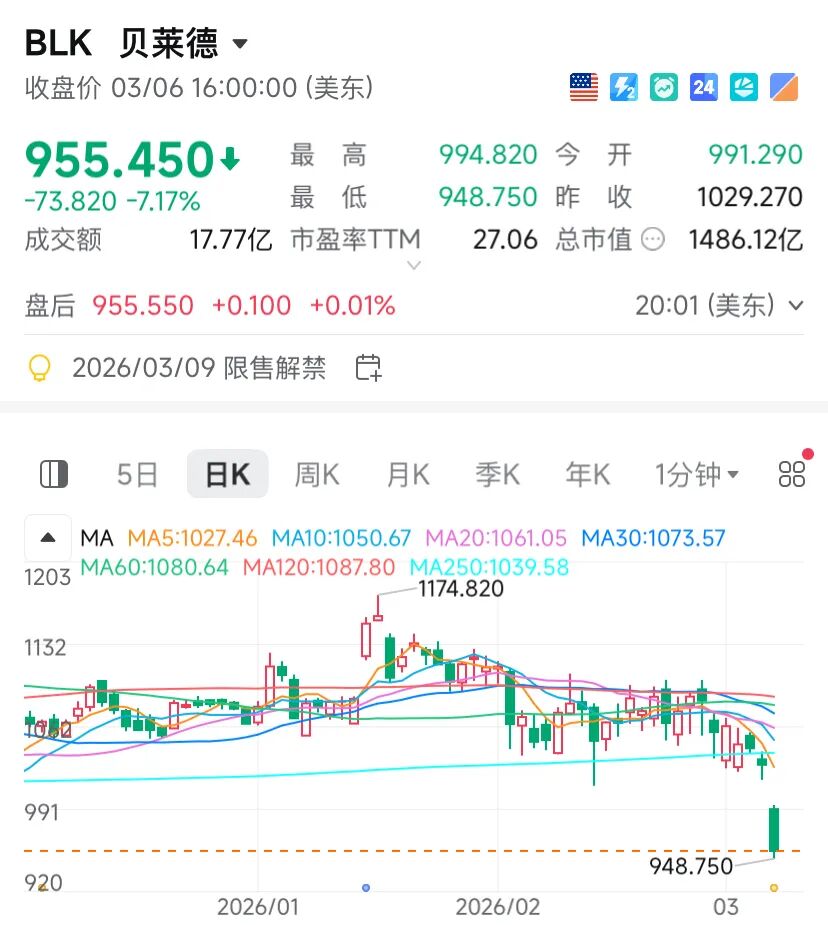 消息公布后,贝莱德股价当地时间3月6日收跌7.17%。Blue Owl和Ares Management等另类资产管理公司股价亦同步下挫。此前,Blue Owl曾宣布出售14亿美元私募信贷贷款应对赎回。