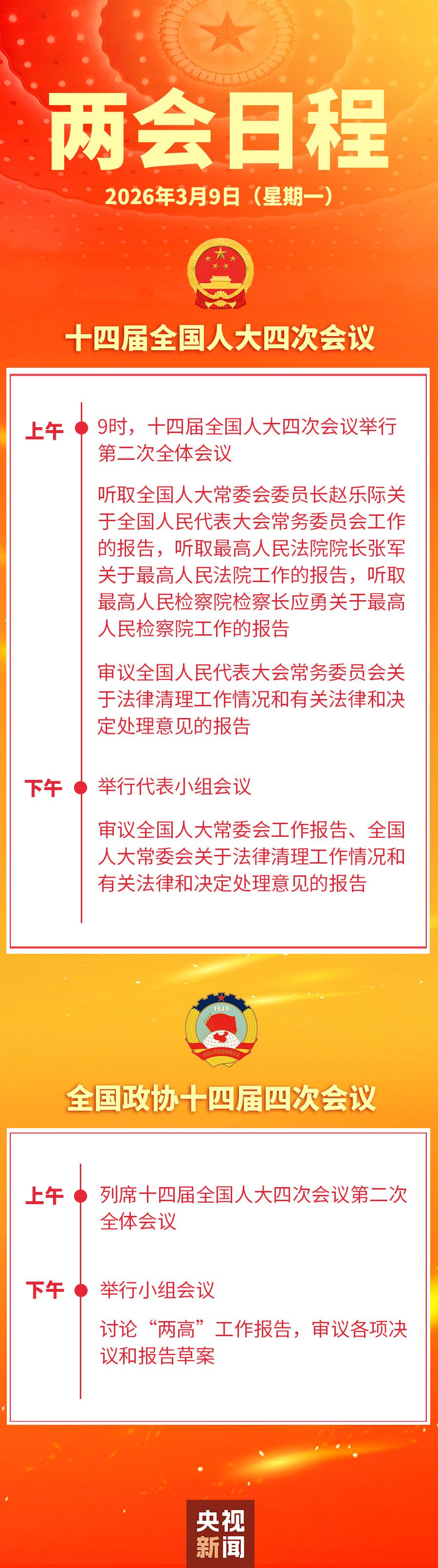 9日上午,出席全国政协十四届四次会议的全国政协委员列席十四届全国人大四次会议第二次全体会议;下午,全国政协十四届四次会议举行小组会议,讨论“两高”工作报告,审议各项决议和报告草案。
