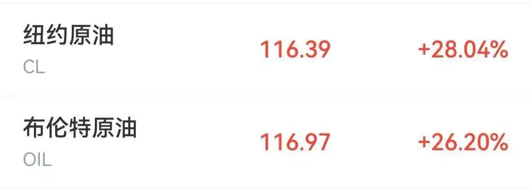 截至发稿,WTI原油期货涨28.04%,报116.39美元/桶,布伦特原油涨26.2%,报116.97美元/桶。而上一次油价突破每桶100美元大关,还是在2022年俄乌冲突爆发之后。
