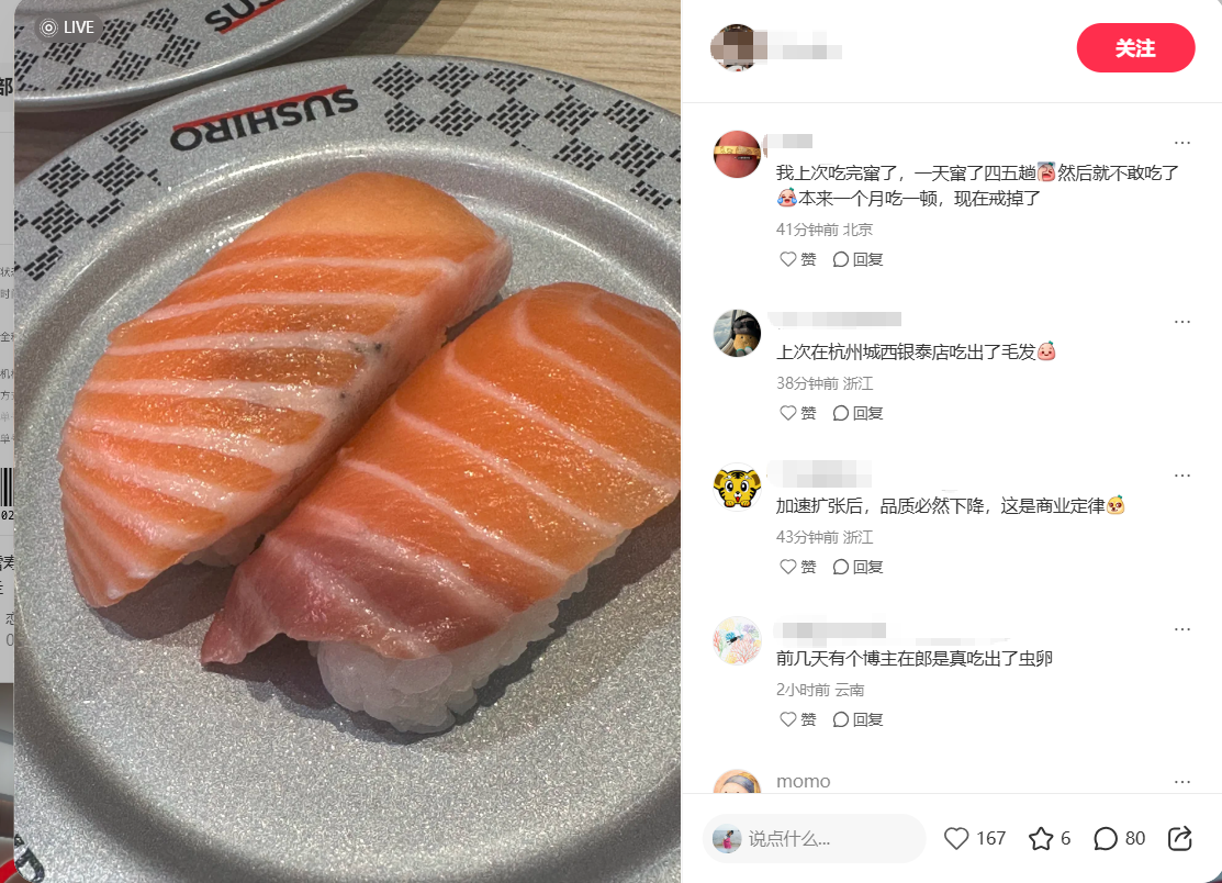 在事件曝光后,多位网友在社交媒体内容下留言,反映自己或他人在“寿司郎”用餐后也曾出现腹泻、在食物中发现异物等情况。部分评论直指品牌在快速扩张过程中可能存在的品控隐患,例如有网友评论称“加速扩张后,品质必然下降”。