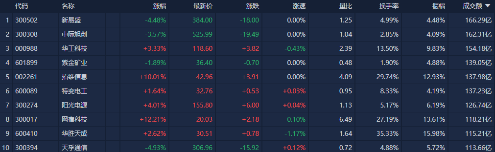 个股方面,新易盛全天成交额超166亿元,位居沪深两市第一;中际旭创、华工科技、紫金矿业、拓维信息等个股成交额靠前。