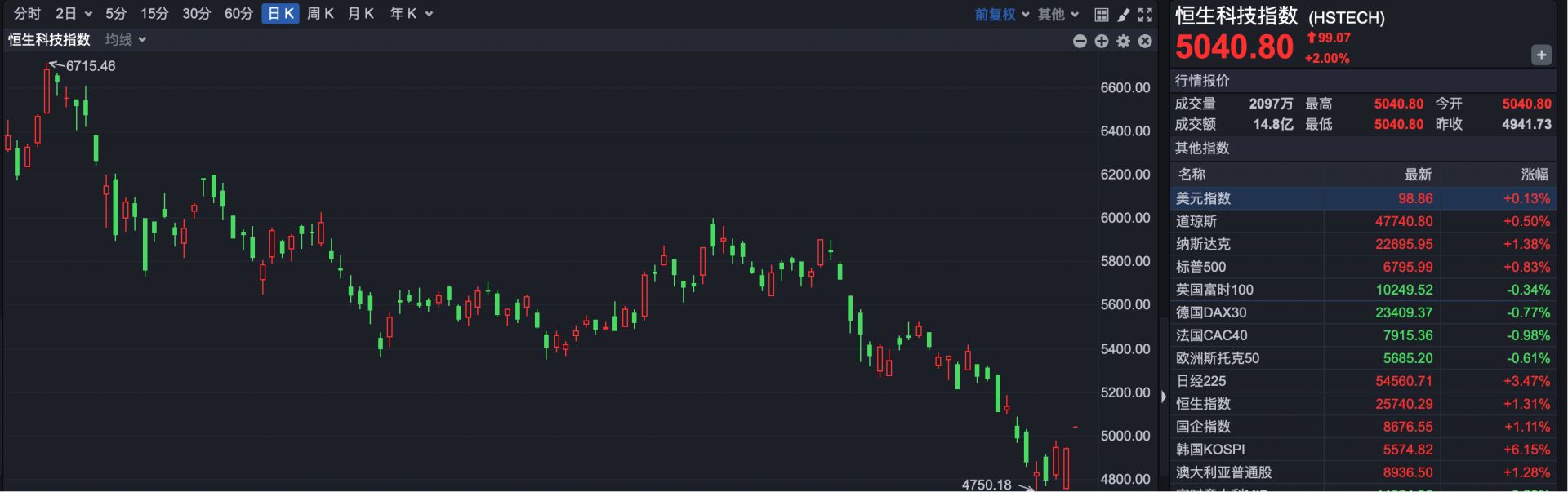 恒生科技指数开盘报5040.80点,上涨99.07点,涨幅2%。
