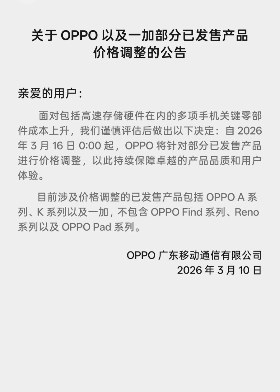 3月10日,OPPO在旗下官方商城发布公告称:面对包括高速存储硬件在内的多项手机关键零部件成本上升,公司谨慎评估后做出决定:自2026年3月16日零时起,OPPO将针对部分已发售产品进行价格调整。