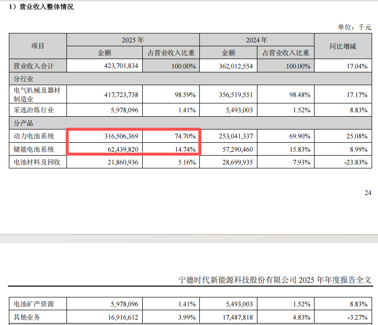2025年,宁德时代动力电池系统、储能电池系统的收入,占营业收入的比重分别为74.70%、14.74%。