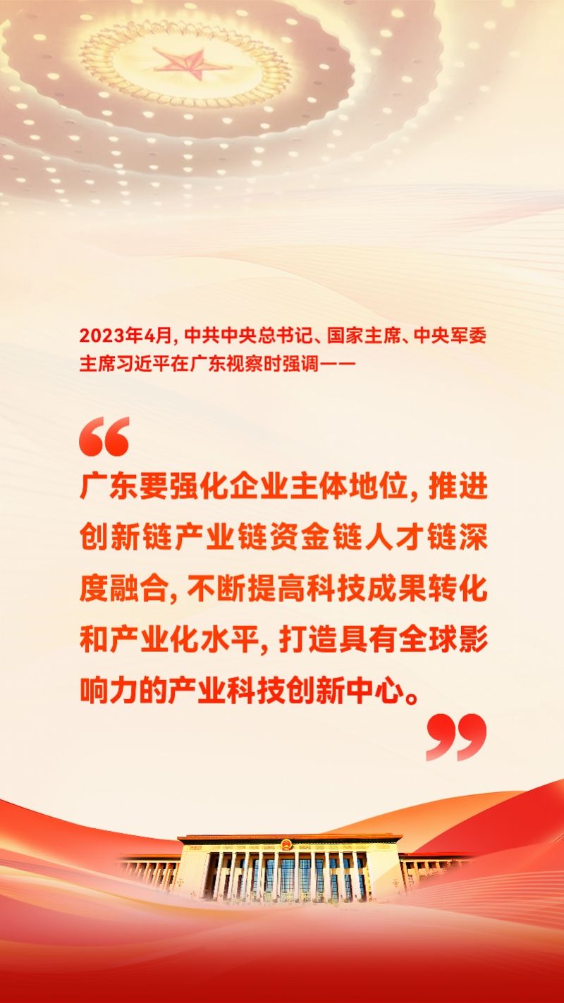 殷殷嘱托,催人奋进。沿着总书记指引的方向,广东以强化企业创新主体地位为抓手,推动创新链、产业链、资金链、人才链深度融合,加快科技成果向现实生产力转化。