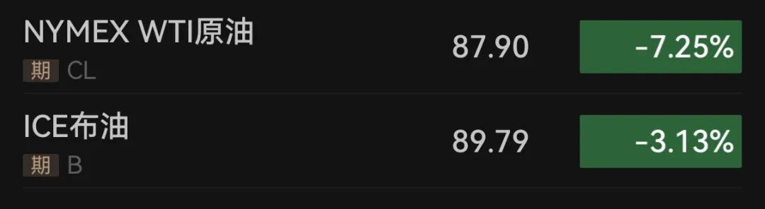 3月10日,WTI原油开盘直线跳水10%至每桶85.52美元,截至发稿,跌幅收窄至7.25%,报87.90美元/桶。
