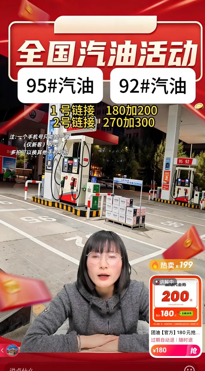 蓝鲸新闻3月10日讯(记者 陆鹏鹏 )“180元团200元油券!哪儿都能用!国营的、民营的都可以!”直播间内主播正在卖力吆喝着。