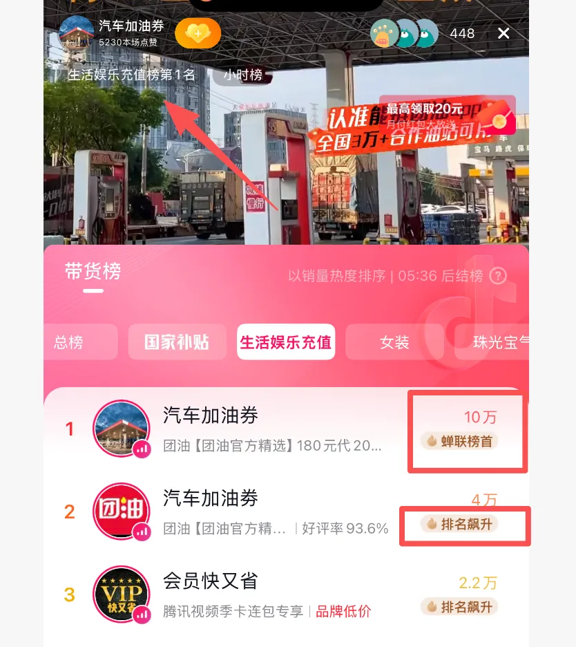 凭借火爆销售势头,该直播间冲上平台“生活娱乐充值榜”榜首。值得注意的是,除该账号外,榜单前列还盘踞着多个直播间,所售产品均为加油优惠券。