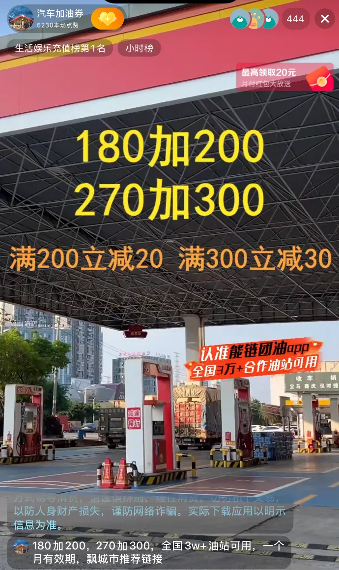 “180元团200元油券!哪儿都能用!爱去哪家去哪家,平时去哪家就去哪家!国营的、民营的都可以!”在多个直播间里,主播们卖力吆喝着团油的优惠券产品,话术极具诱惑力。
