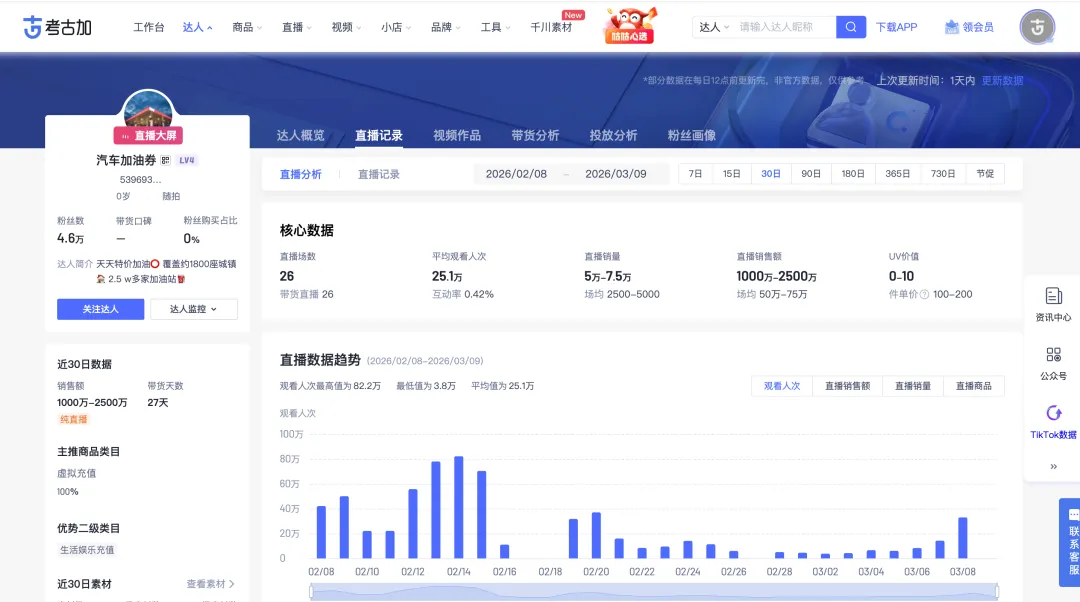 考古加数据显示,该直播间卖优惠券月销高达2500万元,平均观看人次为25万。